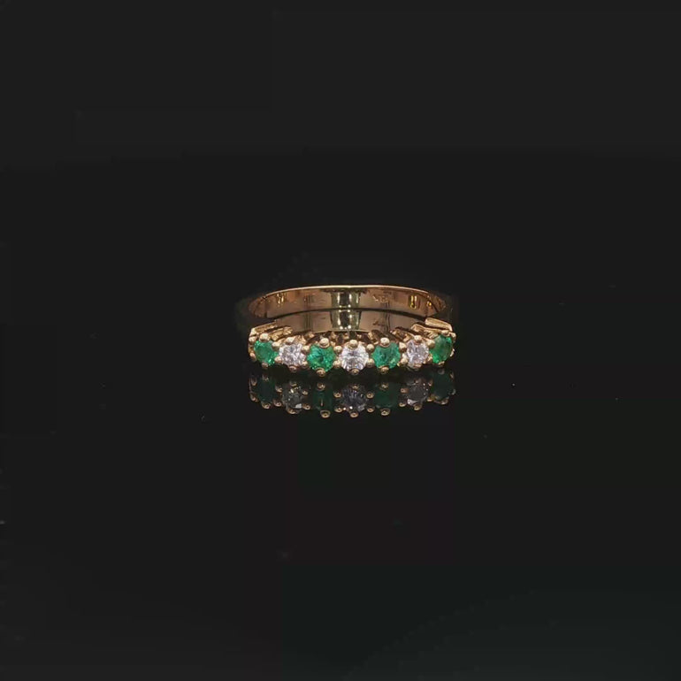 Exquisite yellow gold ring featuring alternating round-cut emeralds and dazzling gemstones set in a classic multistone design. The emeralds display a vivid green hue, transparent clarity, and good symmetry, enhancing the ring's timeless appeal and sophisticated charm.